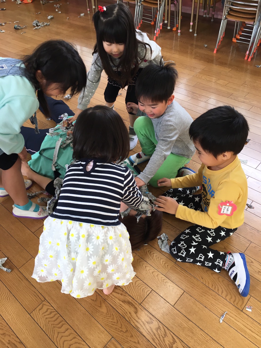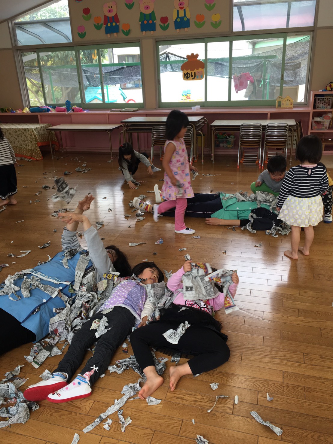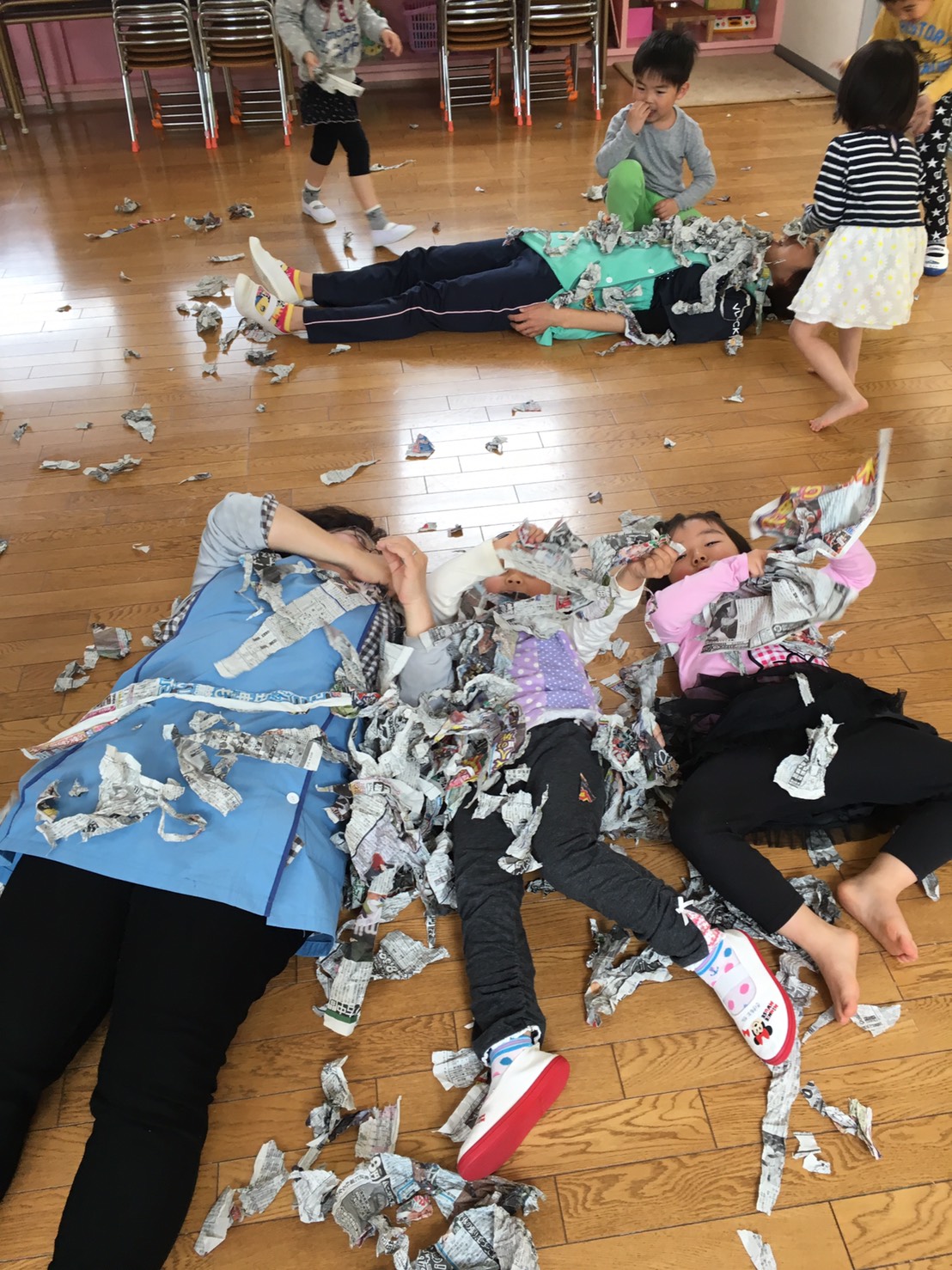 ゆり組さんはお部屋で新聞紙遊びをしていました。