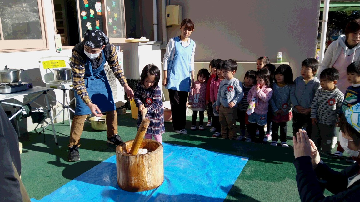 役員さんと一緒ににぎやかにお餅つきの準備が始まりました。