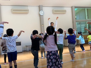 みんなでホールに集まり、遠足ごっこをしました。